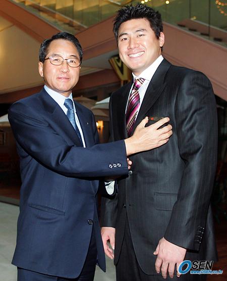 메이저리그 뉴욕 메츠의 서재응이 1일 서울 잠실 롯데월드호텔에서 '일일 지배인'이 됐다. 롯데월드호텔 사장이 서재응에게 지배인 배지를 달아준 뒤 기념 촬영하고 있다./주지영 기자 jj0jj0@ [Copyright ⓒ OSEN(www.osen.co.kr) 무단전재 및 재배포 금지]