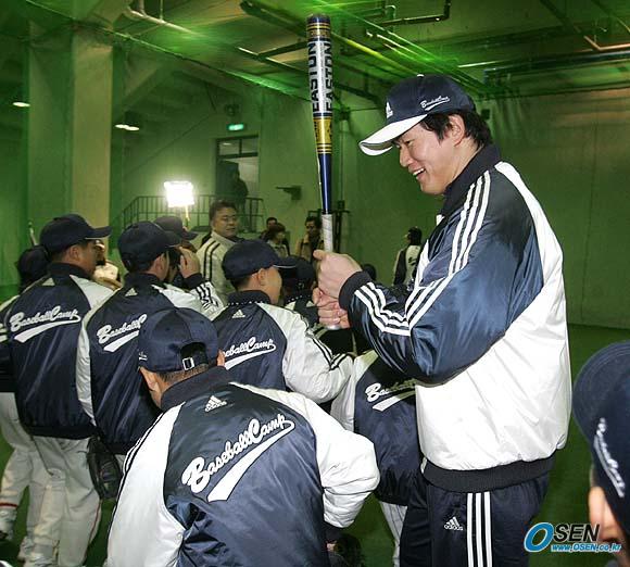 '2005 아디다스 야구캠프'가 메이저리거 서재응 최희섭 및 LG의 박용택, SK의 이진영 등이 참여한 가운데 2일 잠실구장에서 열렸다. 최희섭이 실내에서 열린 타격 클리닉이 끝난 조 선수들에게 빨리 나가서 교대하라며 배트로 장난을 치고 있다./잠실=손용호 기자 spjj@osen.co.kr [Copyright ⓒ OSEN(www.osen.co.kr) 무단전재 및 재배포 금지]