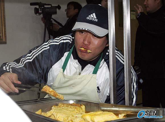 '2005 아디다스 야구캠프'가 메이저리거 서재응 최희섭 및 LG의 박용택, SK의 이진영 등이 참여한 가운데 2일 잠실구장에서 열렸다. 키카 커서 허리를 숙이기가 불편해 의자에 앉아 점심 배식을 하던 최희섭이 계란말이를 먹고 있다./잠실=손용호 기자 spjj@osen.co.kr [Copyright ⓒ OSEN(www.osen.co.kr) 무단전재 및 재배포 금지]