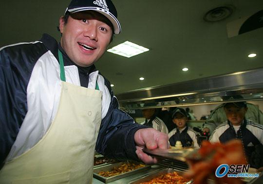 '2005 아디다스 야구캠프'가 메이저리거 서재응 최희섭 및 LG의 박용택, SK의 이진영 등이 참여한 가운데 2일 잠실구장에서 열렸다. 서재응이 점심 배식 도중 카메라에 김치를 먹여주는 시늉을 하며 장난을 치고 있다./잠실=주지영 기자 jj0jj0@osen.co.kr [Copyright ⓒ OSEN(www.osen.co.kr) 무단전재 및 재배포 금지]