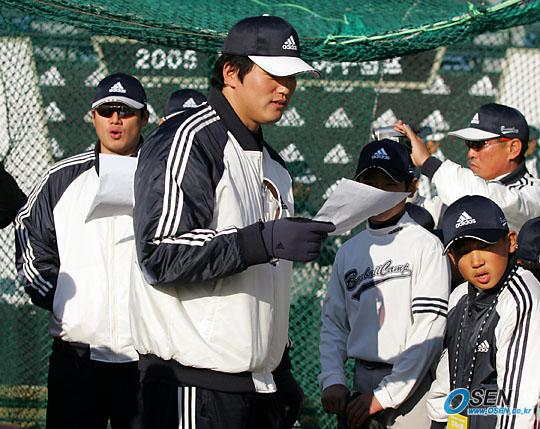 '2005 아디다스 야구캠프'가 메이저리거 서재응 최희섭 및 LG의 박용택, SK의 이진영 등이 참여한 가운데 2일 잠실구장에서 열렸다. 오후의 연습경기에 앞서 최희섭과 서재응(왼쪽)이 자신이 감독을 맡은 팀 선수 명단을 불러주고 있다./잠실=주지영 기자 jj0jj0@osen.co.kr [Copyright ⓒ OSEN(www.osen.co.kr) 무단전재 및 재배포 금지]
