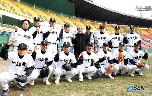 오는 13일 대만에서 벌어지는 한국-일본-대만의 올드스타 친선경기에 출전할 한국의 올드스타팀인 일구회가 3일 잠실 구장에서 연예인 야구팀 조마조마와 연습경기를 가졌다. 전원 야구 선수 출신인 일구회는 조마조마의 '뚝 떨어지는 직구' 등 아주 느린 공에 적응을 못하는 진풍경을 연출했다. 경기가 열리기 전 일구회 선수들이 기념사진을 찍고 있다./잠실=손용호 기자 spjj@ [Copyright ⓒ OSEN(www.osen.co.kr) 무단전재 및 재배포 금지]