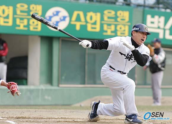 오는 13일 대만에서 벌어지는 한국-일본-대만의 올드스타 친선경기에 출전할 한국의 올드스타팀인 일구회가 3일 잠실 구장에서 연예인 야구팀 조마조마와 연습경기를 가졌다. 박노준 SBS 해설위원이 조마조마 투수의 느린 볼에 타이밍을 맞추지 못해 헛스윙하고 있다./잠실=손용호 기자 spjj@ [Copyright ⓒ OSEN(www.osen.co.kr) 무단전재 및 재배포 금지]