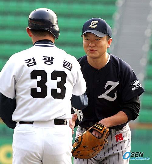 오는 13일 대만에서 벌어지는 한국-일본-대만의 올드스타 친선경기에 출전할 한국의 올드스타팀인 일구회가 3일 잠실 구장에서 연예인 야구팀 조마조마와 연습경기를 가졌다. 경기장에 지각해 4회부터 출전한 조마조마의 '컬투' 김태균이 1루에서 김광림과 인사하고 있다./잠실=손용호 기자 spjj [Copyright ⓒ OSEN(www.osen.co.kr) 무단전재 및 재배포 금지]
