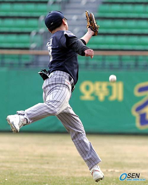 오는 13일 대만에서 벌어지는 한국-일본-대만의 올드스타 친선경기에 출전할 한국의 올드스타팀인 일구회가 3일 잠실 구장에서 연예인 야구팀 조마조마와 연습경기를 가졌다. 4회말 일구회 김광수의 플라이볼을 조마조마의 1루수인 '컬투'의 김태균이 낙구 지점을 못 찾아 떨어뜨리고 있다./잠실=손용호 기자 spjj [Copyright ⓒ OSEN(www.osen.co.kr) 무단전재 및 재배포 금지]