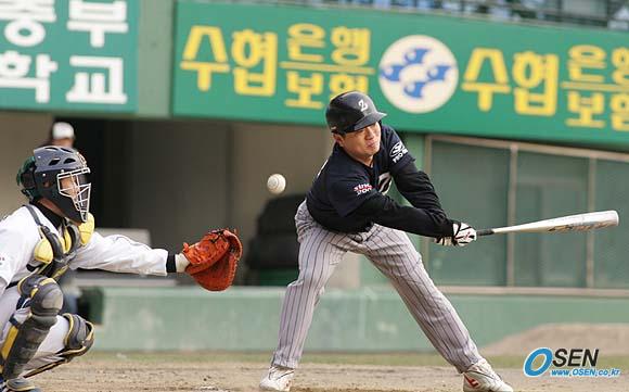 오는 13일 대만에서 벌어지는 한국-일본-대만의 올드스타 친선경기에 출전할 한국의 올드스타팀인 일구회가 3일 잠실 구장에서 연예인 야구팀 조마조마와 연습경기를 가졌다. 7회초 선두타자로 나온 조마조마의 '컬투' 김태균이 일구회 투수 정삼흠의 투구에 파울볼을 내고 있다. 결국 헛스윙으로 삼진 아웃./잠실=손용호 기자 spjj@ [Copyright ⓒ OSEN(www.osen.co.kr) 무단전재 및 재배포 금지]