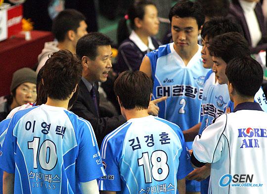 프로배구 KT&G 2005-2006 V-리그가 3일 대전 천안 구미에서 개막됐다. 대전 충무체육관서 벌어진 대전 삼성화재 블루팡스와 인천 대한항공 점보스의 경기서 대한항공의 문용관 감독이 선수들에게 작전을 지시하고 있다. 삼성화재가 3-0으로 완승했다./대전=주지영 기자 jj0jj0@ [Copyright ⓒ OSEN(www.osen.co.kr) 무단전재 및 재배포 금지]