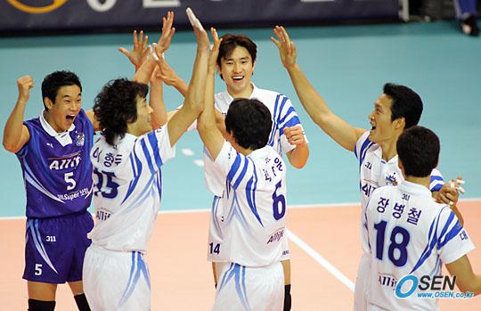 프로배구 KT&G 2005-2006 V-리그가 3일 대전 천안 구미에서 개막됐다. 대전 충무체육관서 벌어진 대전 삼성화재 블루팡스와 인천 대한항공 점보스의 경기서 3-0으로 완승한 삼성화재 선수들이 기뻐하며 하이파이브를 나누고 있다./대전=주지영 기자 jj0jj0@ [Copyright ⓒ OSEN(www.osen.co.kr) 무단전재 및 재배포 금지]