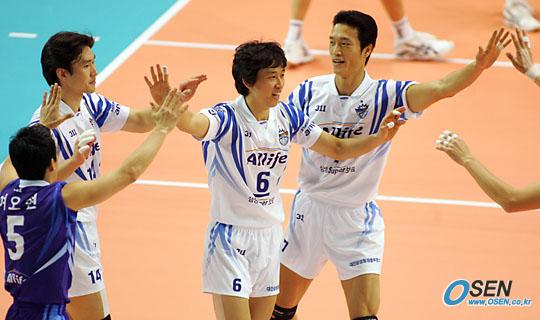 프로배구 KT&G 2005-2006 V-리그가 3일 대전 천안 구미에서 개막됐다. 대전 충무체육관서 벌어진 대전 삼성화재 블루팡스와 인천 대한항공 점보스의 경기서 3-0으로 완승한 삼성화재 선수들이 기뻐하고 있다./대전=주지영 기자 jj0jj0@ [Copyright ⓒ OSEN(www.osen.co.kr) 무단전재 및 재배포 금지]