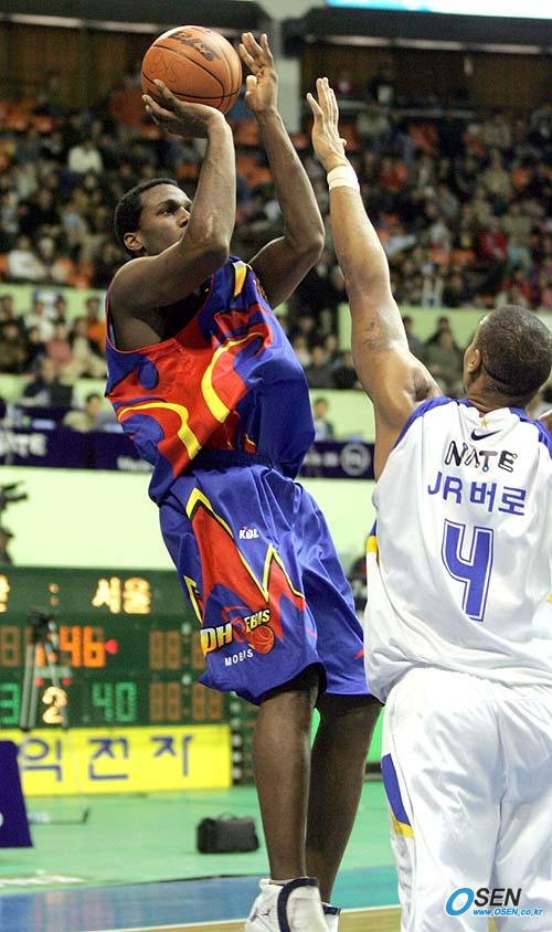3일 잠실학생체육관에서 벌어진 2005~2006 KCC 프로농구 서울 SK와 울산 모비스의 경기 3쿼터서 모비스의 윌리엄스가 SK 버로가 블로킹을 시도하자 몸을 뒤로 젖히며 페이드어웨이슛을 던지고 있다. 윌리엄스는 시즌 4번째 트리플더블을 기록했다./잠실학생체=손용호 기자 spjj@ [Copyright ⓒ OSEN(www.osen.co.kr) 무단전재 및 재배포 금지]