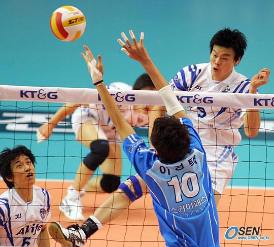 프로배구 KT&G 2005-2006 V-리그가 3일 대전 천안 구미에서 개막됐다. 대전 충무체육관서 벌어진 대전 삼성화재 블루팡스와 인천 대한항공 점보스의 경기서 삼성화재 신선호의 중앙 공격을 대한항공 센터 이영택이 단독 블로킹으로 막아내고 있다./대전=주지영 기자 jj0jj0@ [Copyright ⓒ OSEN(www.osen.co.kr) 무단전재 및 재배포 금지]