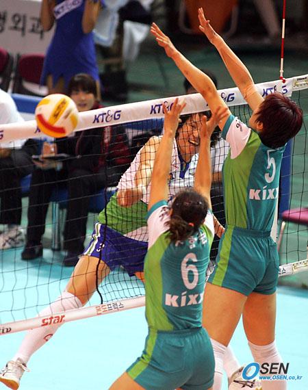 프로배구 KT&G 2005-2006 V-리그가 3일 대전 천안 구미에서 개막됐다. 대전 충무체육관서 벌어진 KT&G와 GS칼텍스의 여자부 경기서 KT&G의 '왕언니' 최광희(31)가 오픈 공격을 성공시키고 있다./대전=주지영 기자 jj0jj0@ [Copyright ⓒ OSEN(www.osen.co.kr) 무단전재 및 재배포 금지]