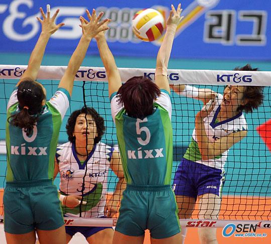 프로배구 KT&G 2005-2006 V-리그가 3일 대전 천안 구미에서 개막됐다. 대전 충무체육관서 벌어진 KT&G와 GS칼텍스의 여자부 경기서 KT&G의 임명옥이 GS칼텍스 우형순(왼쪽)과 나혜원의 블로킹을 앞에 놓고 스파이크를 넣고 있다./대전=주지영 기자 jj0jj0@ [Copyright ⓒ OSEN(www.osen.co.kr) 무단전재 및 재배포 금지]
