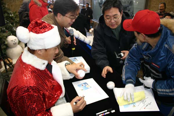롯데 마린스의 이승엽이 4일 오후 추운 날씨에서도 서울 소공동 롯데백화점 앞에서 불우이웃돕기를 위해 사인볼을 개당 1만 원에 팔고 성금함도 마련해 팬사인회를 가졌다. 이승엽이 팬에게 사인해 주고 있다./박승현 기자 nanga@ [Copyright ⓒ OSEN(www.osen.co.kr) 무단전재 및 재배포 금지]