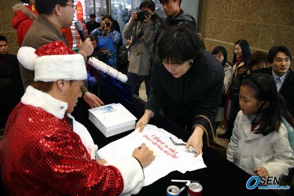 롯데 마린스의 이승엽이 4일 오후 추운 날씨에서도 서울 소공동 롯데백화점 앞에서 불우이웃돕기를 위해 사인볼을 개당 1만 원에 팔고 성금함도 마련해 팬사인회를 가졌다. 딸을 데리고 온 여성 팬이 티셔츠에 이승엽의 사인을 받고 있다./박승현 기자 nanga@ [Copyright ⓒ OSEN(www.osen.co.kr) 무단전재 및 재배포 금지]