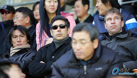 4일 2005 삼성 하우젠리그 챔피언 결정전 2차전이 벌어진 울산 문수 월드컵경기장을 찾은 대표팀의 홍명보 코치, 압신 고트비 보조코치, 핌 베어벡 수석코치(가운데줄 왼쪽으로부터)가 관중석에서 지켜보고 있다./울산=주지영 기자 jj0jj0@ [Copyright ⓒ OSEN(www.osen.co.kr) 무단전재 및 재배포 금지]