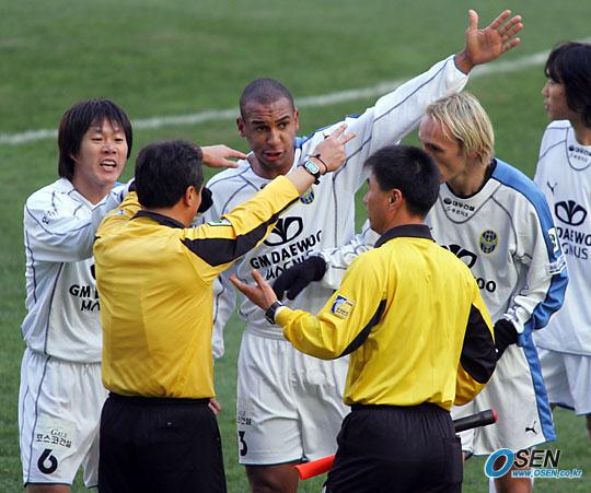 4일 울산 문수 월드컵경기장에서 벌어진 2005 삼성 하우젠리그 챔피언 결정전 2차전에서 전반 울산의 최성국이 1-1 동점골을 넣자 인천 선수들이 심판에게 핸들링 반칙이 있었다고 항의하고 있다./울산=주지영 기자 jj0jj0@ [Copyright ⓒ OSEN(www.osen.co.kr) 무단전재 및 재배포 금지]