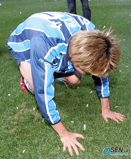 4일 울산 문수 월드컵경기장에서 벌어진 2005 삼성 하우젠리그 챔피언 결정전 2차전을 끝으로 우승을 확정지은 울산의 이천수가 관중들을 향해 큰 절을 올리고 있다./울산=손용호 기자 spjj@ [Copyright ⓒ OSEN(www.osen.co.kr) 무단전재 및 재배포 금지]
