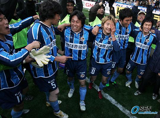 4일 울산 문수 월드컵경기장에서 벌어진 2005 삼성 하우젠리그 챔피언 결정전 2차전을 끝으로 시즌 우승을 차지한 울산 선수들이 어깨동무를 한 채 감격에 겨워하고 있다./울산=손용호 기자 spjj@ [Copyright ⓒ OSEN(www.osen.co.kr) 무단전재 및 재배포 금지]