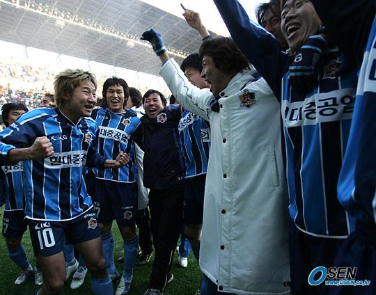 4일 울산 문수 월드컵경기장에서 벌어진 2005 삼성 하우젠리그 챔피언 결정전 2차전을 끝으로 시즌 우승을 차지한 울산 선수들이 어깨동무를 하고 환호하는 가운데 이천수(왼쪽)이 기쁨을 주체하지 못하고 있다./울산=손용호 기자 spjj@ [Copyright ⓒ OSEN(www.osen.co.kr) 무단전재 및 재배포 금지]