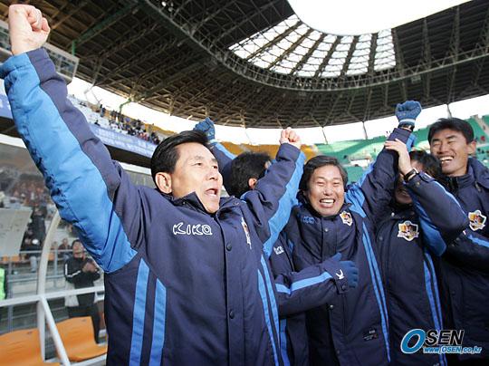 4일 울산 문수 월드컵경기장에서 벌어진 2005 삼성 하우젠리그 챔피언 결정전 2차전이 끝나며 시즌 우승이 확정되는 순간 울산 김정남 감독(왼쪽)과 코치들이 함께 만세를 부르며 기뻐하고 있다./울산=손용호 기자 spjj@ [Copyright ⓒ OSEN(www.osen.co.kr) 무단전재 및 재배포 금지]