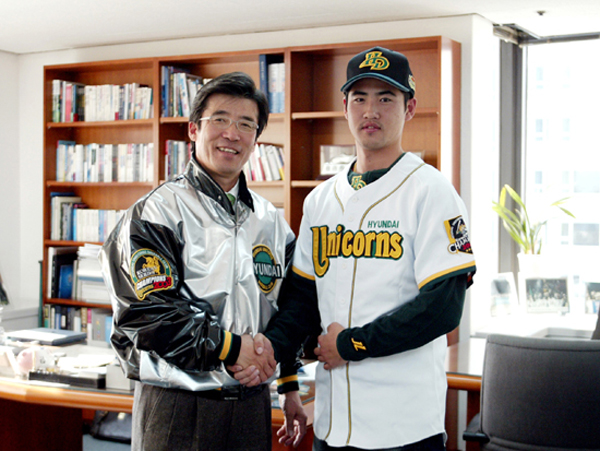 국가대표 출신 좌완 투수 장원삼(22·경성대)이 내년 시즌 대졸 신인 최고 대우로 현대 유니폼을 입었다. 현대 구단은 6일 장원삼과 계약금 2억 5000만 원, 연봉 2000만 원 등 총액 2억 7000만 원에 입단 계약을 했다고 발표했다. 이는 경성대 동기생인 김기표(투수)가 LG에 입단하면서 받은 계약금 2억 1000만 원을 넘어서는 내년도 대졸 신인 최고액이다. 장원삼이 김용휘 현대 사장과 악수를 나누고 있다./현대 유니콘스 제공 [Copyright ⓒ OSEN(www.osen.co.kr) 무단전재 및 재배포 금지]