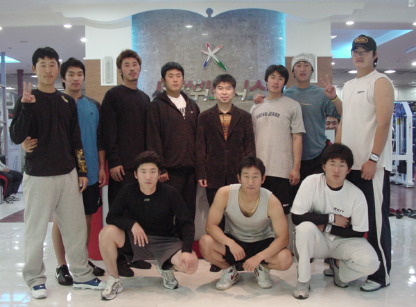 프로야구 신인 사상 최고 계약금(10억 원)을 받고 기아에 입단한 한기주가 에이스 김진우 등 선배들과 광주시 서구 치평동 세정아울렛 내의 세정 피트니스클럽에서 동계 웨이트 트레이닝으로 데뷔 시즌을 준비하고 있다. 한기주(앞줄 오른쪽 끝)와 김진우(뒷줄 오른쪽 끝) 등이 기아 선수들을 위해 시설을 무료 개방하고 있는 유동완 세정 피트니스클럽 사장(뒷줄 오른쪽에서 4번째)과 기념 사진을 찍었다./기아 타이거즈 제공 [Copyright ⓒ OSEN(www.osen.co.kr) 무단전재 및 재배포 금지]
