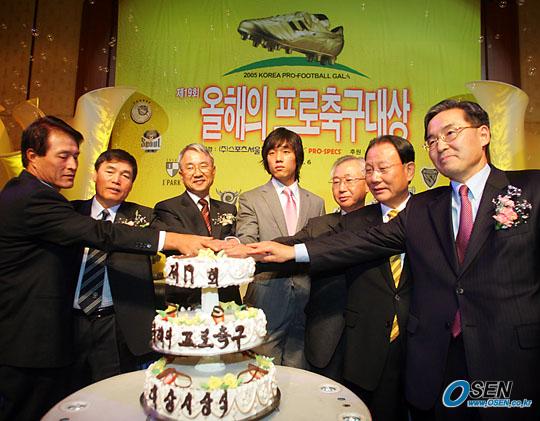 스포츠서울이 (주)국제상사 프로스펙스 협찬, (주)레드원 비더레즈의 후원으로 제정한 제19회 '올해의 프로축구대상' 시상식이 6일 서울 남대문 힐튼 호텔 그랜드볼룸에서 열렸다. 대상인 올해의 선수상, 신인상, 인기상, 득점상을 받은 FC 서울 박주영이 내외빈들과 함께 케이크를 커팅하고 있다./주지영 기자 jj0jj0@osen.co.kr [Copyright ⓒ OSEN(www.osen.co.kr) 무단전재 및 재배포 금지]