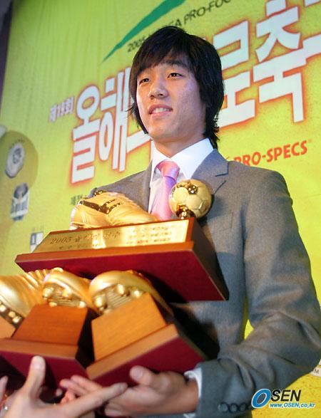 스포츠서울이 (주)국제상사 프로스펙스 협찬, (주)레드원 비더레즈의 후원으로 제정한 제19회 '올해의 프로축구대상' 시상식이 6일 서울 남대문 힐튼 호텔 그랜드볼룸에서 열렸다. 대상인 올해의 선수상을 비롯 신인상 인기상 득점상을 받은 FC 서울의 박주영이 4개의 '골든스타슈'와 '골든볼'을 들고 포즈를 취하고 있다./주지영 기자 jj0jj0@osen.co.kr [Copyright ⓒ OSEN(www.osen.co.kr) 무단전재 및 재배포 금지]