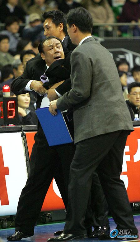 7일 잠실학생체육관에서 벌어진 2005~2005 KCC 프로농구 서울 SK 나이츠와 원주 동부 프로미의 경기서 김태환 SK 감독이 코트 안까지 들어가 강력히 항의하자 강양택 코치(왼쪽)와 오성식 코치가 만류하며 라인 밖으로 데려가고 있다./잠실학생체=주지영 기자 jj0jj0@osen.co.kr [Copyright ⓒ OSEN(www.osen.co.kr) 무단전재 및 재배포 금지]