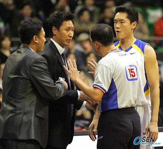 7일 잠실학생체육관에서 벌어진 2005~2005 KCC 프로농구 서울 SK 나이츠와 원주 동부 프로미의 경기서 SK 김태환 감독이 퇴장 당한 뒤 강양택 코치가 심판에게 어필하고 있다. /잠실학생체=주지영 기자 jj0jj0@osen.co.kr [Copyright ⓒ OSEN(www.osen.co.kr) 무단전재 및 재배포 금지]