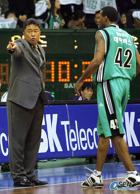 7일 잠실학생체육관에서 벌어진 2005~2006 KCC 프로농구 서울 SK 나이츠와 원주 동부 프로미의 경기서 동부의 전창진 감독이 마크 제이비스에게 손으로 얘기하는 지점을 가리키며 지시하고 있다./잠실학생체=주지영 기자 jj0jj0@osen.co.kr [Copyright ⓒ OSEN(www.osen.co.kr) 무단전재 및 재배포 금지]