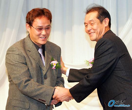 중견 야구인들의 모임인 일구회가 주최하는 제10회 일구상 시상식이 8일 낮 서울 청담동 프리마호텔 다이아몬드홀에서 열렸다. 부상의 시련을 딛고 올 시즌 한화의 에이스로 거듭난 문동환이 ‘불사조’박철순으로부터 재기 선수상을 받고 있다. /주지영 기자 jj0jj0@osen.co.kr [Copyright ⓒ OSEN(www.osen.co.kr) 무단전재 및 재배포 금지]