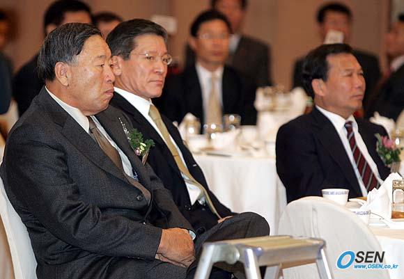 9일 일간스포츠와 제일화재해상보험이 공동 주최한 2005년 제일화재야구대상 시상식이 서울 프라자호텔에서 열렸다. 최근 새 총재 추대설로 구설수를 겪고 있는 김응룡 삼성 사장(왼쪽)이 이경재 한화 사장 등과 함께 사장단석에서 '조용히' 시상식을 지켜보고 있다./손용호 기자 spjj@osen.co.kr [Copyright ⓒ OSEN(www.osen.co.kr) 무단전재 및 재배포 금지]