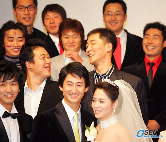 LG의 '쿨 가이' 박용택(26)이 10일 저녁 서울 삼성동 그랜드 콘티넨탈 호텔에서 동갑나기 한진영 씨와 결혼식을 올렸다. 친지들 기념 촬영서 신랑 신부 바로 뒤에 선 LG 이승호(왼쪽)와 유택현이 서로 마주보며 웃고 있다./주지영 기자 jj0jj0@oasen.co.kr [Copyright ⓒ OSEN(www.osen.co.kr) 무단전재 및 재배포 금지]