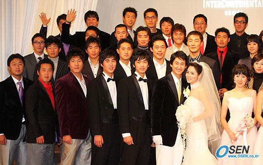 LG의 '쿨 가이' 박용택(26)이 10일 저녁 서울 삼성동 그랜드 콘티넨탈 호텔에서 동갑나기 한진영 씨와 결혼식을 올렸다. 야구계 동료들끼리 기념 촬영하고 있는 박용택 부부. 뒷줄 왼쪽에서 이병규와 김광삼이 손을 흔들고 있다./주지영 기자 jj0jj0@oasen.co.kr [Copyright ⓒ OSEN(www.osen.co.kr) 무단전재 및 재배포 금지]