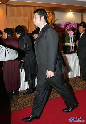 '찬호, 결혼 축하해'. 11일 서울 소공동 롯데호텔에서 열린 '박찬호 메이저리그 100승 달성 축하회 및 결혼 피로연'에는 박찬호(32.샌디에이고 파드리스)가 빅리거 생활을 시작했던 친정팀인 LA 다저스 구단주 및 동료가 참석해 자리를 빛냈다. 박찬호의 결혼을 축하하기 위해 한국땅을 찾은 다저스 출신은 피터 오말리 전 구단주, 일본 출신의 라이벌이자 절친한 동료였던 노모 히데오(사진) 등이다. 전 동료는 아니지만 현재 다저스에서 1루수로 뛰고 있는 빅리거 한국인 후배인 최희섭(26)도 참석해 선배 박찬호를 축하했다. 또 박찬호가 미국 진출 초기 옆에서 도움을 줬던 안병환 전 경남상고 감독이자 현 다저스 아시아지역 스카우트도 자리를 함께 했다. 지난 달 30일 미국 하와이에서 치렀던 결혼식에도 참석했던 오말리 구단주는 한국까지 방문해 다시 한 번 박찬호의 결혼 및 빅리그 100승 달성을 축하했다. 오말리 구단주의 축사는 메이저리그 전문가인 송재우 Xports TV 해설위원이 동시통역을 맡아 눈길을 끌었다. 축하회가 시작되기 전 일찌감치 식장을 찾은 노모는 박찬호를 찾아 축하인사를 건넸다. 노모는 또 자신을 알아본 한국 및 일본 팬들의 사인 및 기념촬영 요구에 응하는 등 박찬호 못지 않게 바빴다. 롯데호텔=글, 박선양 기자 sun@osen.co.kr 사진, 손용호 기자 spjj@osen.co.kr [Copyright ⓒ OSEN(www.osen.co.kr) 무단전재 및 재배포 금지]