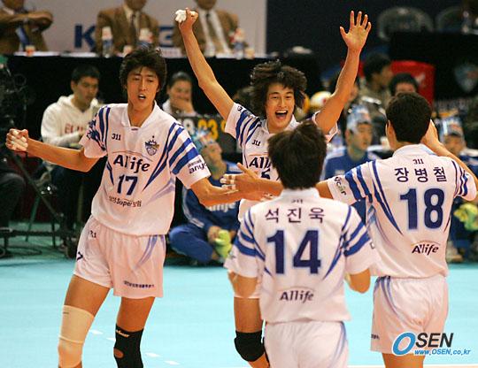 11일 대전 충무체육관에서 벌어진 프로배구 2005~2006 V-리그 대전 삼성화재 블루팡스와 천안 현대캐피탈 스카이워크스의 시즌 첫 대결에서 삼성화재가 3-1로 승리, 4승 1패로 단독 선두에 나섰다. 삼성화재의 이형두(가운데)이 공격을 성공시킨 뒤 두 팔을 들어 올리며 환호하고 있다./대전=주지영 기자 jj0jj0@osen.co.kr [Copyright ⓒ OSEN(www.osen.co.kr) 무단전재 및 재배포 금지]