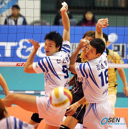 11일 대전 충무체육관에서 벌어진 프로배구 2005~2006 V-리그 대전 삼성화재 블루팡스와 천안 현대캐피탈 스카이워크스의 시즌 첫 대결에서 삼성화재가 3-1로 승리, 4승 1패로 단독 선두에 나섰다. 삼성화재의 신선호(왼쪽)와 장병철이 볼을 통과시킨 뒤 아쉬운 표저으로 뒤를 돌아보고 있다./대전=주지영 기자 jj0jj0@osen.co.kr [Copyright ⓒ OSEN(www.osen.co.kr) 무단전재 및 재배포 금지]