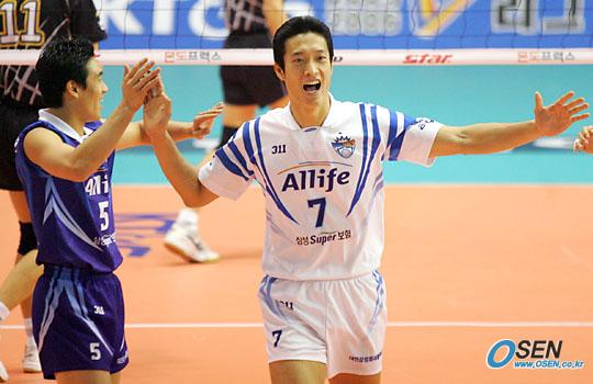 11일 대전 충무체육관에서 벌어진 프로배구 2005~2006 V-리그 대전 삼성화재 블루팡스와 천안 현대캐피탈 스카이워크스의 시즌 첫 대결에서 삼성화재가 3-1로 승리, 4승 1패로 단독 선두에 나섰다. 삼성화재의 김상우가 점수를 따낸 뒤 기뻐하고 있다./대전=주지영 기자 jj0jj0@osen.co.kr [Copyright ⓒ OSEN(www.osen.co.kr) 무단전재 및 재배포 금지]