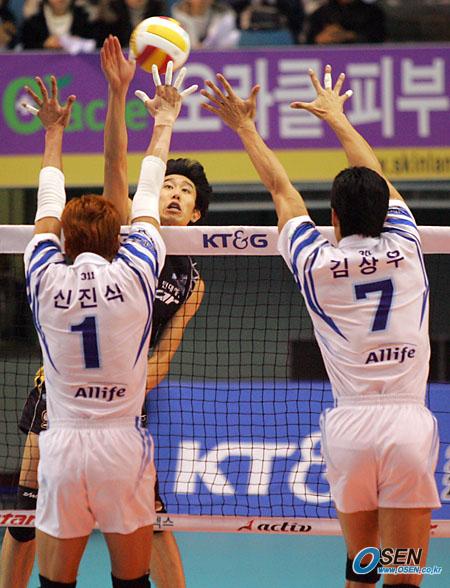 11일 대전 충무체육관에서 벌어진 프로배구 2005~2006 V-리그 대전 삼성화재 블루팡스와 천안 현대캐피탈 스카이워크스의 시즌 첫 대결에서 삼성화재가 3-1로 승리, 4승 1패로 단독 선두에 나섰다. 현대캐피탈의 후인정이 삼성화재 신진식과 김상우의 블로킹 앞에서 강타를 날리고 있다./대전=주지영 기자 jj0jj0@osen.co.kr [Copyright ⓒ OSEN(www.osen.co.kr) 무단전재 및 재배포 금지]
