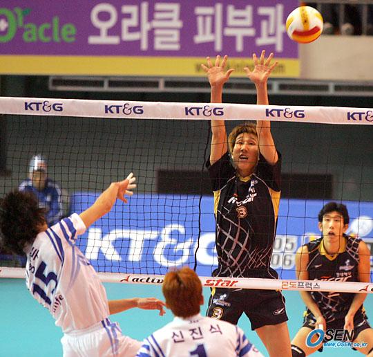 11일 대전 충무체육관에서 벌어진 프로배구 2005~2006 V-리그 대전 삼성화재 블루팡스와 천안 현대캐피탈 스카이워크스의 시즌 첫 대결에서 삼성화재가 3-1로 승리, 4승 1패로 단독 선두에 나섰다. 현대캐피탈의 권영민이 삼성화재 이형두의 공격을 단독 블로킹하고 있다./대전=주지영 기자 jj0jj0@osen.co.kr [Copyright ⓒ OSEN(www.osen.co.kr) 무단전재 및 재배포 금지]