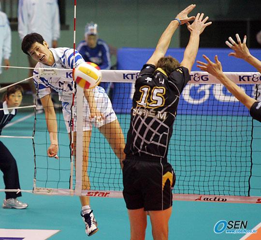 11일 대전 충무체육관에서 벌어진 프로배구 2005~2006 V-리그 대전 삼성화재 블루팡스와 천안 현대캐피탈 스카이워크스의 시즌 첫 대결에서 삼성화재가 3-1로 승리, 4승 1패로 단독 선두에 나섰다. 삼성화재의 라이트 주공 장병철이 현대캐피탈의 장신(206cm) 숀 루니의 블로킹을 위해 강타를 넣고 있다./대전=주지영 기자 jj0jj0@osen.co.kr [Copyright ⓒ OSEN(www.osen.co.kr) 무단전재 및 재배포 금지]