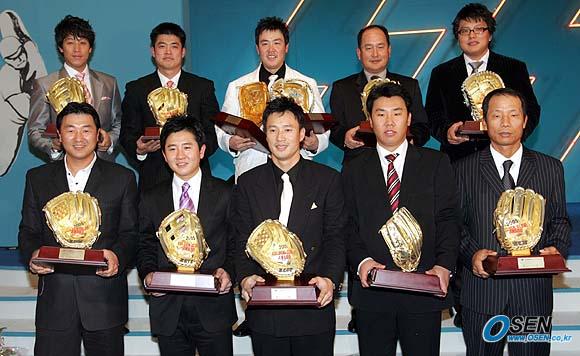 11일 오후 서울 삼성동 코엑스 오디토리움에서 벌어진 삼성PAVV 프로야구 2005 골든글러브 수상자들이 기념사진을 찍고 있다. 앞줄 오른쪽의 김용달 현대 코치는 서트, 뒷줄 오른쪽에서 두 번째의 정영기 한화 코치는 데이비스를 대신해 수상했다./손용호 기자 spjj@osen.co.kr [Copyright ⓒ OSEN(www.osen.co.kr) 무단전재 및 재배포 금지]