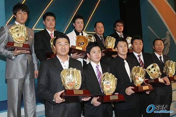 11일 오후 서울 삼성동 코엑스 오디토리움에서 벌어진 삼성PAVV 프로야구 2005 골든글러브 수상자들이 기념사진을 찍고 있다. 앞줄 오른쪽의 김용달 현대 코치는 서트, 뒷줄 오른쪽에서 두 번째의 정영기 한화 코치는 데이비스를 대신해 수상했다./손용호 기자 spjj@osen.co.kr [Copyright ⓒ OSEN(www.osen.co.kr) 무단전재 및 재배포 금지]