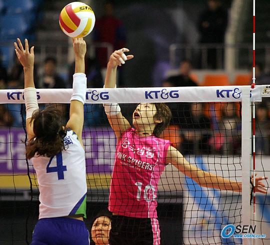 11일 대전 충무체육관서 벌어진 프로배구 KT&G 2005-2006 V-리그 여자부 KT&G 아리엘즈와 흥국생명 핑크 스파이더스의 경기서 흥국생명이 3-0으로 낙승했다. 흥국생명의 장신(187cm) 신인 김연경이 연타로 KT&G 이효희의 블로킹을 피하고 있다./대전=주지영 기자 jj0jj0@osen.co.kr [Copyright ⓒ OSEN(www.osen.co.kr) 무단전재 및 재배포 금지]