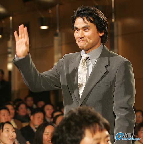 11일 오후 서울 삼성동 코엑스 오디토리움에서 벌어진 삼성PAVV 프로야구 2005 골든글러브 시상식에 이날 낮 100승 사은회를 가진 박찬호 부부가 참석했다. 박찬호가 사회자의 소개로 일어나 관객들에게 손을 흔들며 인사하고 있다./손용호 기자 spjj@osen.co.kr [Copyright ⓒ OSEN(www.osen.co.kr) 무단전재 및 재배포 금지]
