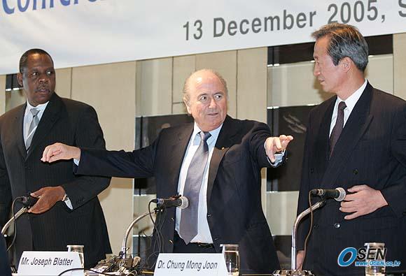 일본을 거쳐 13일 오전 인천공항을 통해 내한한 제프 블래터 국제축구연맹회장이 이날 오후 서울 하얏트 호텔에서 기자회견을 가졌다. 블래터 회장이 하야투 부회장과 정몽준 부회장에게 자리에 앉으라고 얘기를 하고 있다./손용호 기자 spjj@osen.co.kr [Copyright ⓒ 한국 최고의 스포츠 전문 미디어 OSEN(www.osen.co.kr) 무단전재 및 재배포 금지]