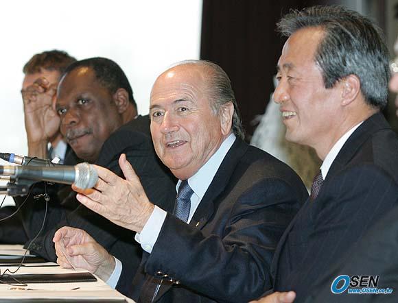 일본을 거쳐 13일 오전 인천공항을 통해 내한한 제프 블래터 국제축구연맹회장이 이날 오후 서울 하얏트 호텔에서 기자회견을 가졌다. 자신의 모국인 스위스가 한국과 같은 조가 될 때 어떤 심정이었냐는 질문에 블래터 회장이 '유니폼이 같은 빨간색이어서 기뻤다'고 말하며 웃고 있다./손용호 기자 spjj@osen.co.kr [Copyright ⓒ 한국 최고의 스포츠 전문 미디어 OSEN(www.osen.co.kr) 무단전재 및 재배포 금지]