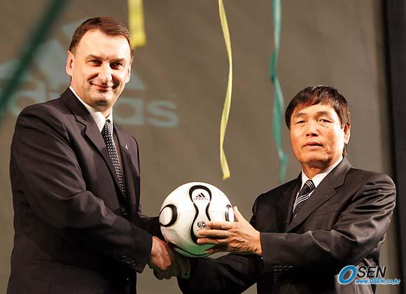 13일 저녁 서울 반포의 센트럴시티 밀레니엄 홀에서 아디다스사가 대한축구협회에 2006 독일월드컵 공인구 '팀 가이스트' 를 전달하는 이벤트가 열렸다. 벤트하이머 아디다스 코리아 사장이 이회택 대한축구협회 부회장에게 공인구를 전달하고 있다./손용호 기자 spjj@osen.co.kr [Copyright ⓒ 한국 최고의 스포츠 전문 미디어 OSEN(www.osen.co.kr) 무단전재 및 재배포 금지]
